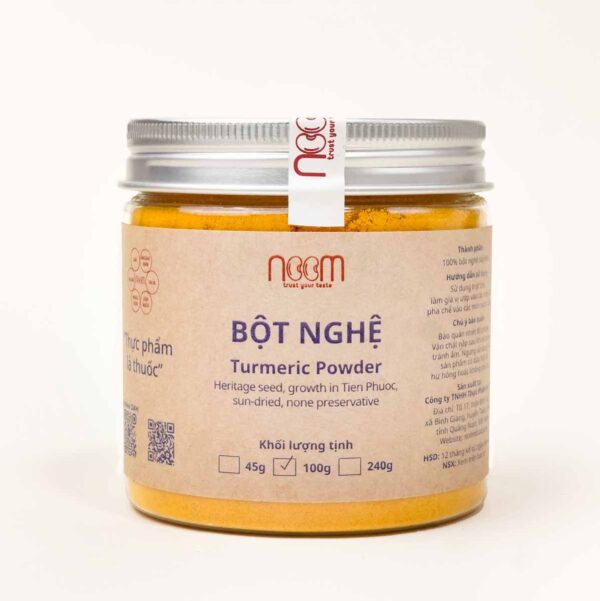 Bột nghệ xay mịn từ 100% nghệ sấy khô được trồng tại vườn canh tác tự nhiên Tiên Phước, có vị thơm đằm đặc trưng, hoàn toàn không tinh chế, chiết xuất, giữ trọn dược tính tự nhiên, là vị thuốc Đông Y và Ayurveda cổ đại.